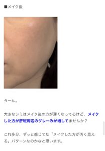 「大きなシミはメイク後の方が薄くなってるけど」「肝斑はグレーみが増してる」って書いてる!